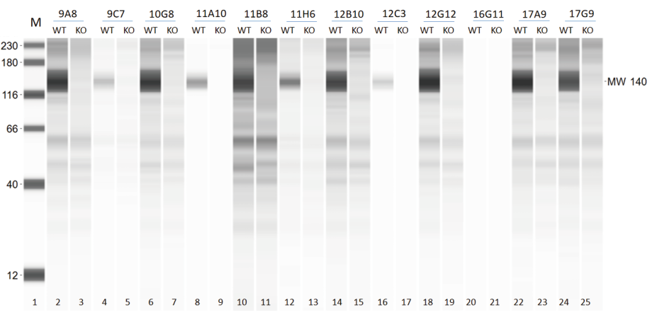 Yurogen has successfully developed rabbit monoclonal antibodies against an important inflammasome component that work in Immunohistochemistry (IHC) for one of Yurogen’s big pharma clients, utilizing Yurogen’s SMab™ platform. As many antibodies that work in Western blot (WB) tend to work in IHC as well, high-throughput automated WB was introduced in the early stage (B cell culture supernatants) to identify potential antibody clones suitable for IHC. A total of 192 ELISA-positive B cell culture supernatants from 1920 sorted B cells were screened against inflammasome component-expressing wild-type or knockout cell lines. The best candidates were then selected for rabbit IgG gene cloning and recombinant expression. IHC staining using the recombinant antibodies on wild-type and knockout cell lines was then conducted. Many clones that worked in WB also performed well in IHC.