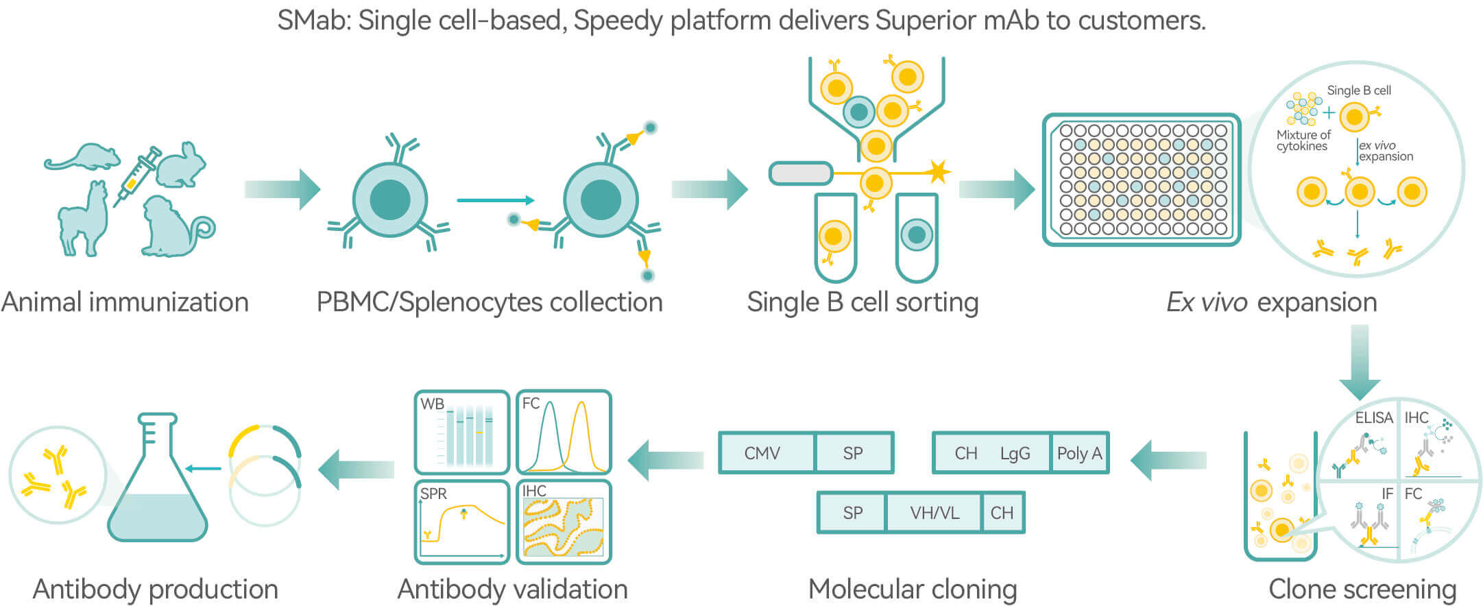 The core of SMab™ platform lies in the modern immunological technology combined with cell sorting technology to screen single antibody-secreting cells (B lymphocytes) from immunized animals, and then amplify the antibody-coding genes obtained using modern molecular biology techniques. Thereby producing genetically engineered monoclonal antibodies with market value through large-scale in vitro expression. The specific process of rabbit monoclonal antibody development is as follows: